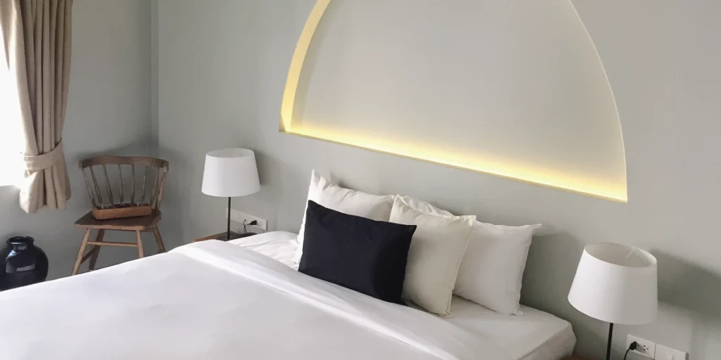 Di kamar tidur, posisi lampu juga memegang peranan penting dalam menciptakan suasana yang nyaman dan menenangkan. Lampu utama sebaiknya ditempatkan di tengah ruangan untuk memberikan pencahayaan umum yang merata. Untuk lampu tidur, letakkan di sisi tempat tidur dengan ketinggian yang mudah dijangkau. Pastikan cahaya lampu tidur tidak terlalu terang agar tidak mengganggu kualitas tidur. Jika Anda memiliki lampu baca, posisikan di samping tempat tidur dengan sudut yang dapat disesuaikan, sehingga cahaya dapat difokuskan pada buku tanpa menyilaukan mata.